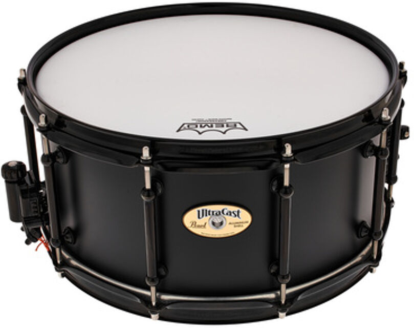 "Pearl 14""x6,5"" Ultra Cast Snare, Caisse claire, Taille: 14"" x 6,5"", Série Ultra Cast, Fût en aluminium de 3 mm avec anneaux de renfort, Cercles triple flange Super Hoop II de 2,3 mm, Coquilles tubulaires, Déclencheur SR-1000 Glide-Lock, Accastillage noir, Timbre Ultra-Sound, Peaux Remo Ambassador"Caractéristiques