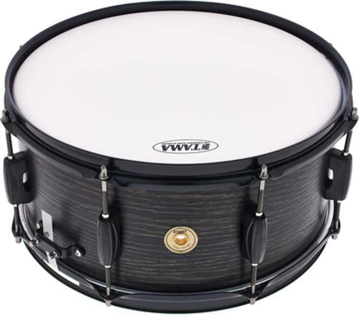 "Tama 14""x6,5"" Woodworks Snare - BOW, Caisse claire 14""x6,5"", Série Woodworks, WP1465BK-BOW, Fût en peuplier (8 plis - 8 mm), Accastillage noir, Cercles Triple Flange 1,6 mm, 8 tirants par cercle, Timbre 20 brins, Finition: Rhodoïd, Couleur: Black Oak Wrap"Caractéristiques