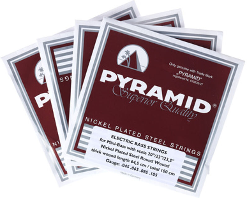 "Pyramid Mini Bass 20""/23""/23,5"" Set, Jeu de cordes pour basse électrique miniature, Convient aux basses électriques d'un diapason de 20"", 23"" ou 23,5"", En acier nickelé, Filets ronds, Ames hexagonales en acier, Distance entre l'extrémité à boule et l'enroulement de soie: 645 mm, Longueur totale: 1000 mm, Tirants: .045, .065, .085, .105"